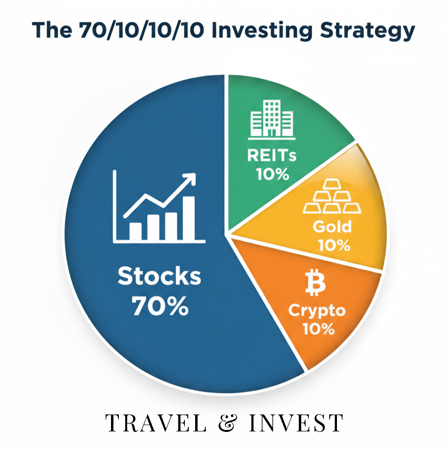 One powerful way to harness your investment psychology is following a structured approach like the 70/10/10/10 investing strategy that removes emotional decision-making from your wealth-building journey. This method allocates 70% to global stocks, 10% to REITs, 10% to gold, and 10% to cryptocurrency; creating a behavioral finance framework that keeps you disciplined when markets get crazy.