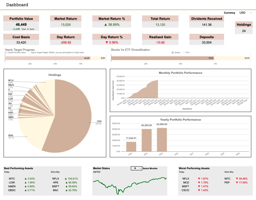 Experience a new level of control and clarity with the Portfolio & Dividend Tracker for Google Sheets. This all-in-one tool is thoughtfully designed for everyone—from first-time investors to experienced pros—making it simple to track and improve your investments. With an organised dashboard and intuitive features, you’ll always have a clear snapshot of your stocks, dividends, and overall performance.