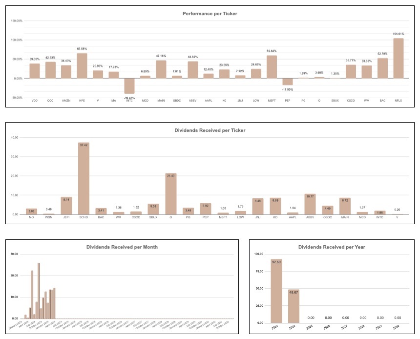 – Performance Analytics: Dive into detailed analytics with graphs depicting daily and total performance per ticker. Monitor your portfolio’s monthly performance trends and make data-driven decisions to enhance your investment strategy.